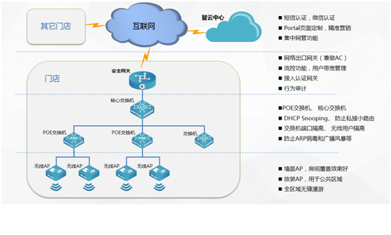 面对移动互联网大潮对传统行业的冲击,运用云计算、移动社交、大数据分析等技术,为酒店、餐饮、休闲娱乐、零售商超等商业市场客户构建基础网络平台,加速商业市场客户业务创新和转型已经刻不容缓,9888拉斯维加斯智云商业解决方案志在为商业客户给予最强的用户体验,给予最具商业价值的云网络,给予基于portal认证,短信、微信营销功能。